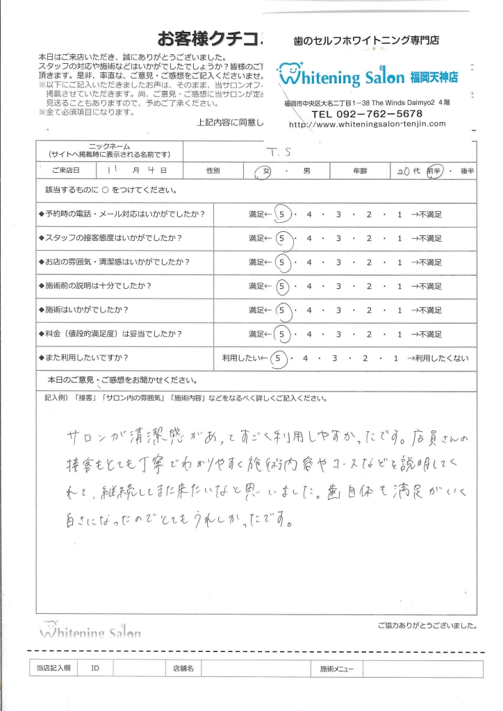 落ち着いた店内で、毎回リラックスしながら施術を受けることができ、さらに歯が白くトーンアップしていく様子が分かり大変満足しております。