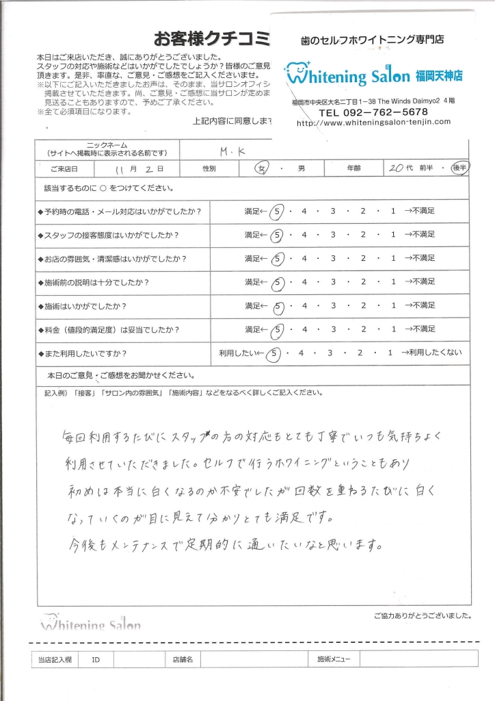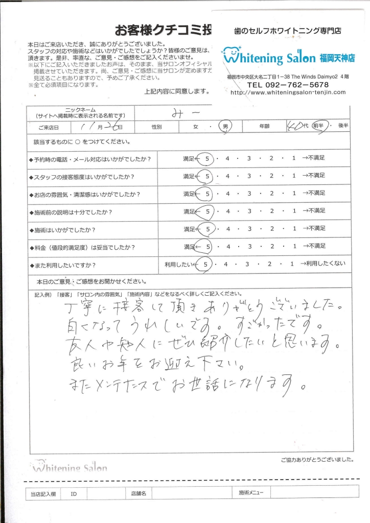 ホワイトニングの効果も目に見えて実感できたので、これからも定期的に利用させていただきたいです。