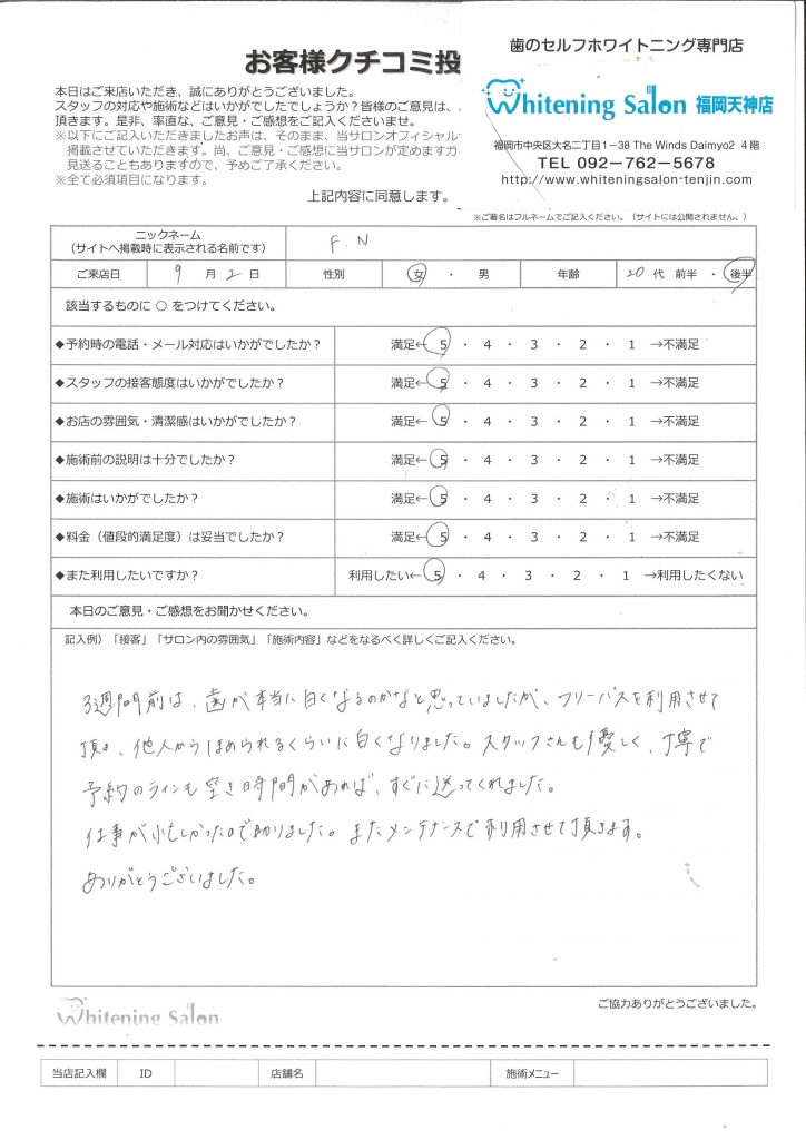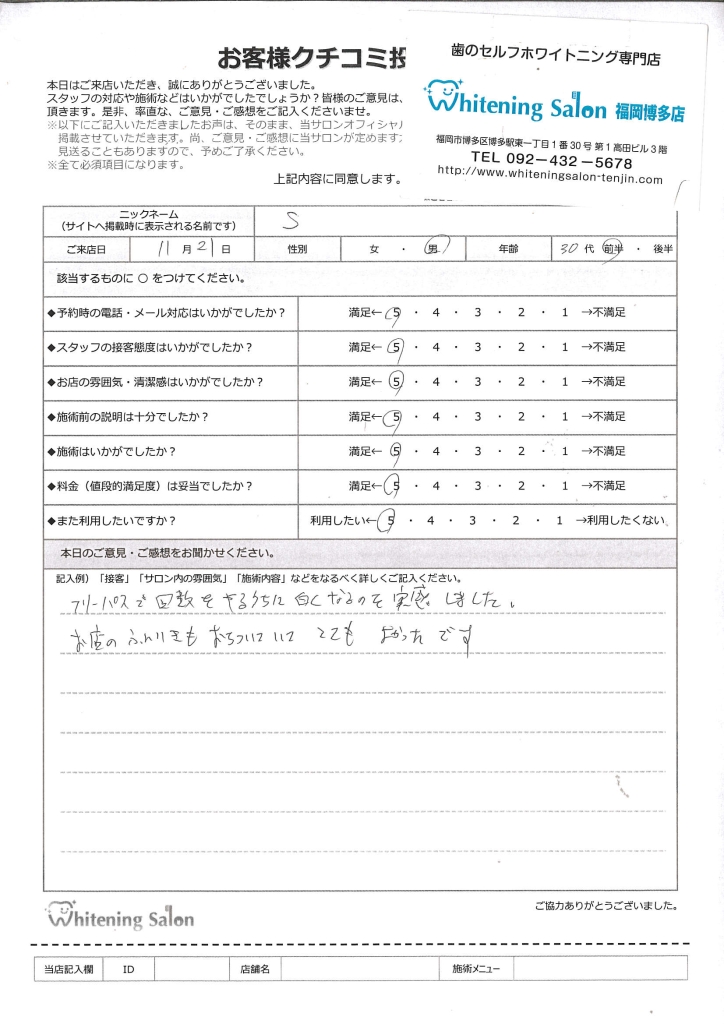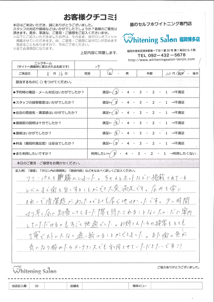 3週間前は、歯が本当に白くなるのかなと思っていましたが、フリーパスを利用させて頂き、他人から褒められるくらい白くなりました。
