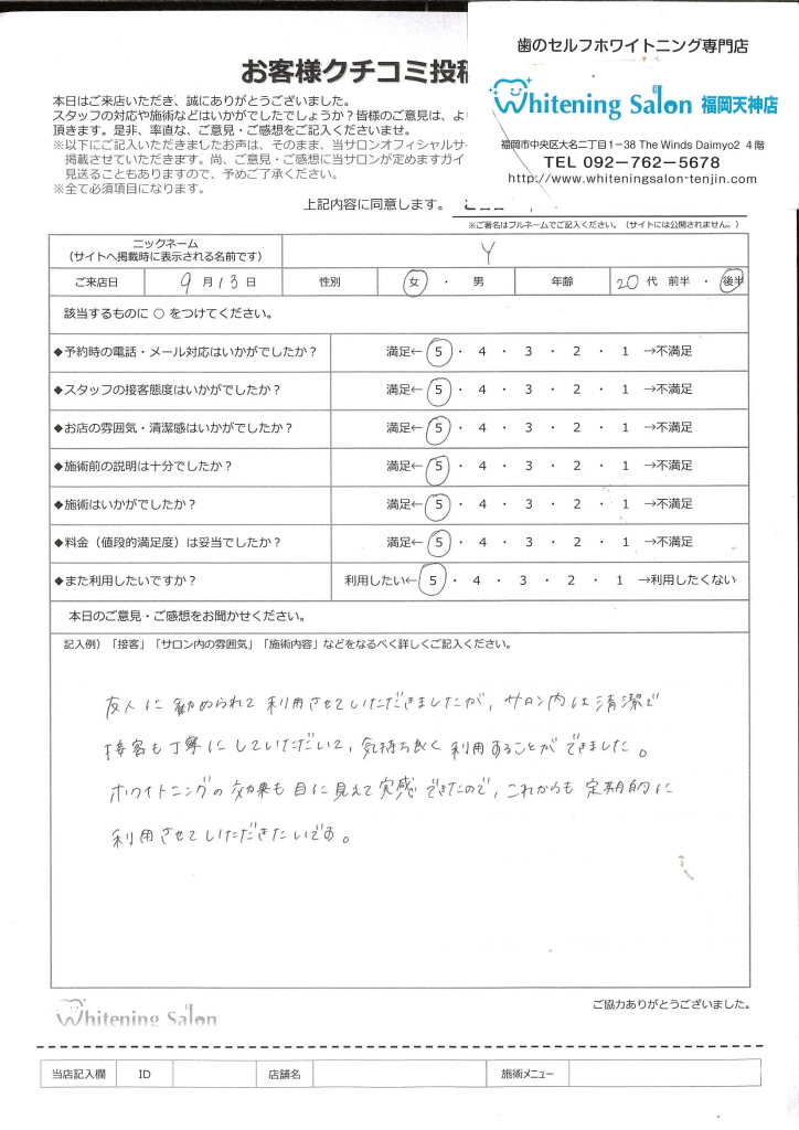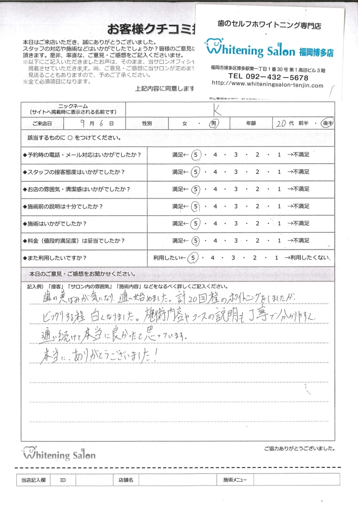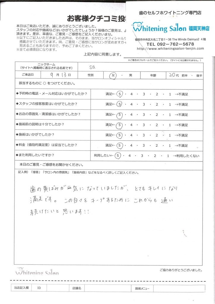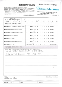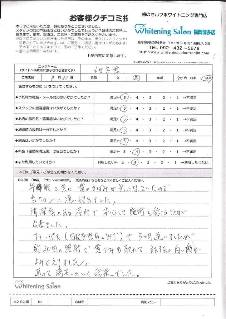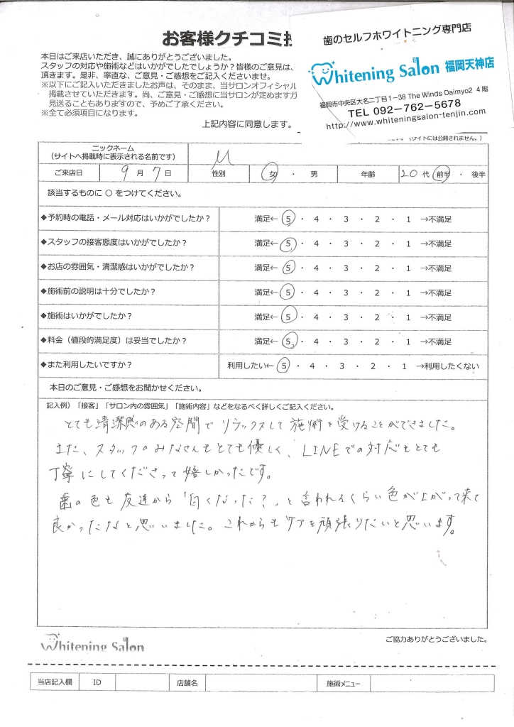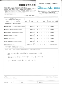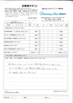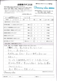 歯医者のホワイトニングは何だか気が進まなかったので博多駅近くのこのサロンを見つけ通い出したところ、みるみる白くなり大満足です。