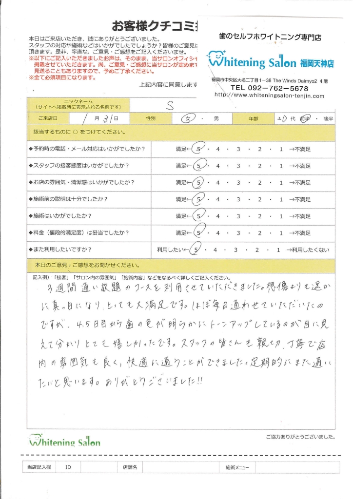 ホワイトニングの効果も目に見えて実感できたので、これからも定期的に利用させていただきたいです。